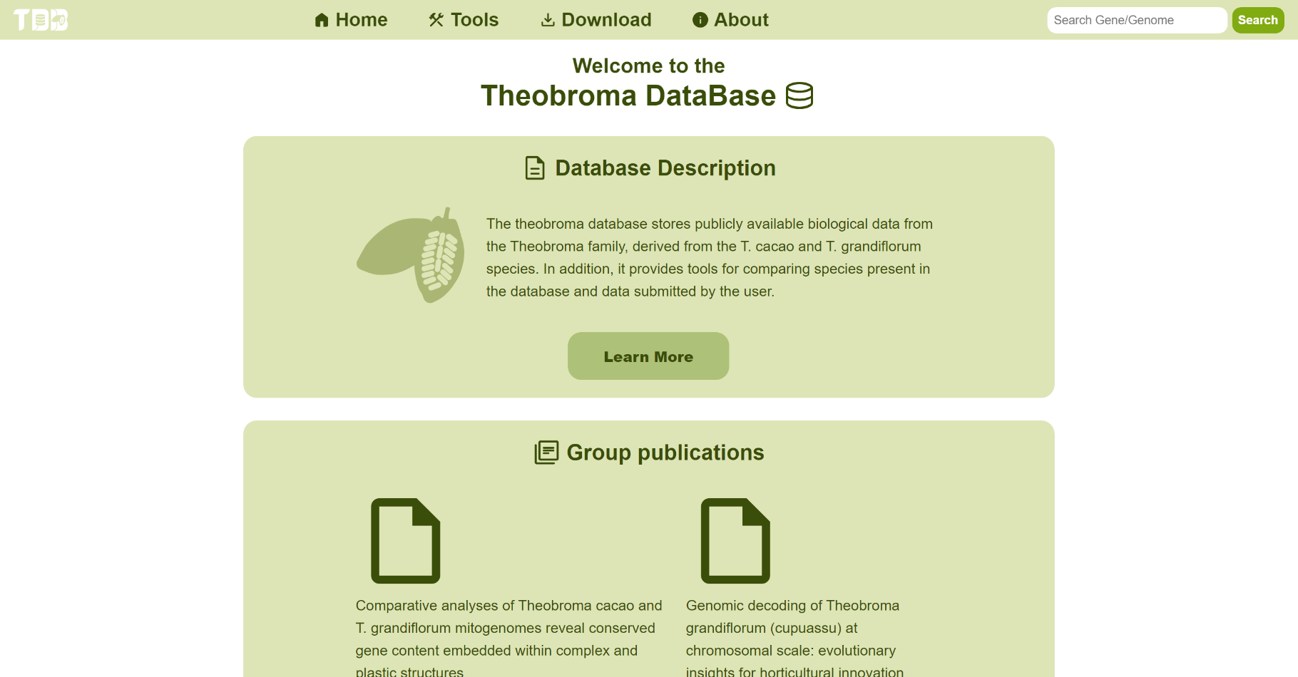 O Theobroma DataBase armazena dados biológicos publicamente disponíveis da família Theobroma, derivados das espécies T. cacao e T. grandiflorum. Além disso, disponibiliza ferramentas para comparação de espécies presentes na base de dados e dados submetidos pelo usuário. O Theobroma DataBase é mantido pelo Laboratório de Bioinformática e computação de alto desempenho (LaBioCAD), localizado na Universidade Federal do Pará (UFPA). Além disso, em sua primeira versão recebeu apoio da CAPES-FAPESPA, FAPESPA e UNESP.
